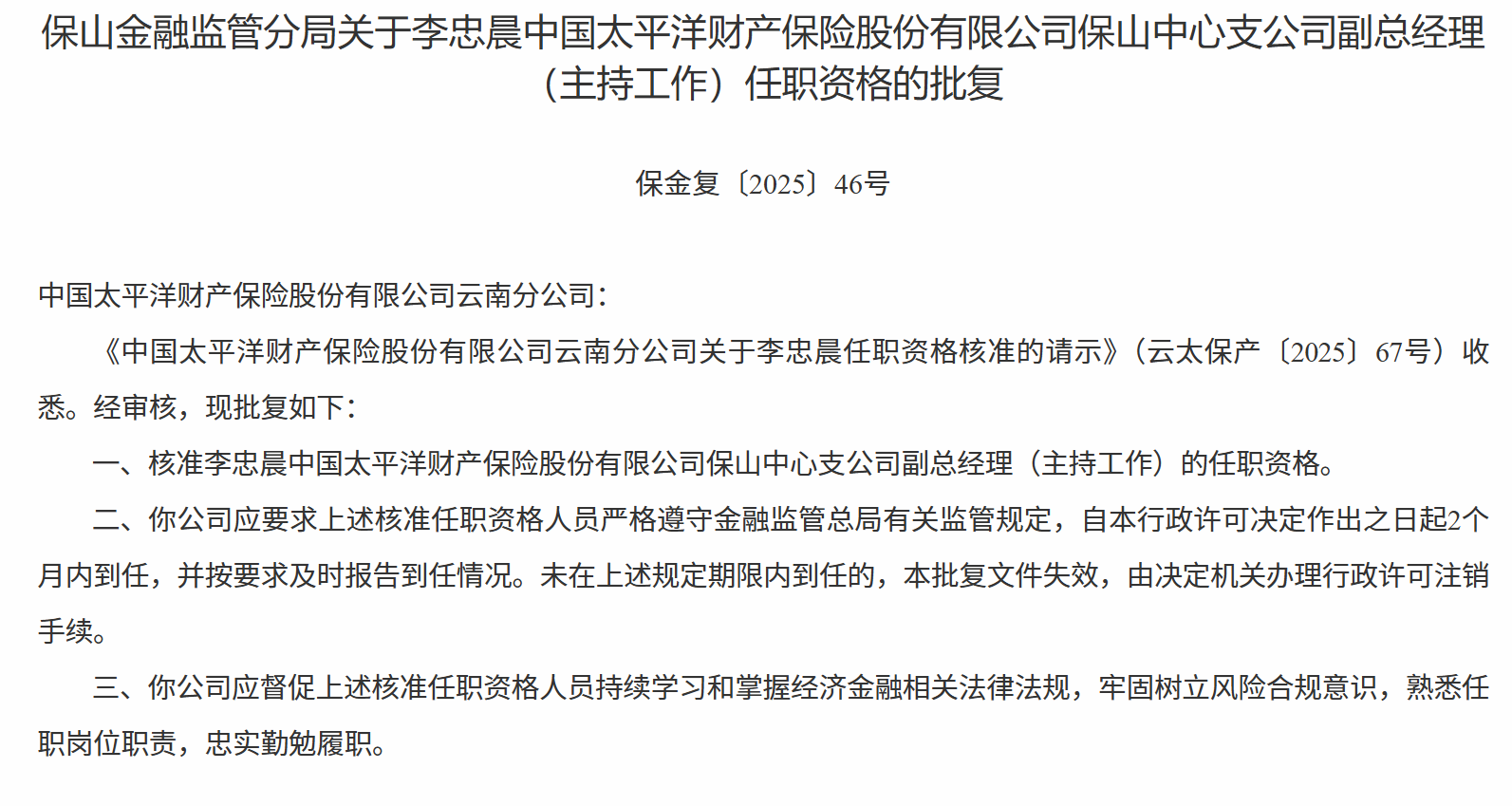 配资平台排行榜第一名 李忠晨获批担任太平洋财险保山中心支公司副总经理(主持工作)