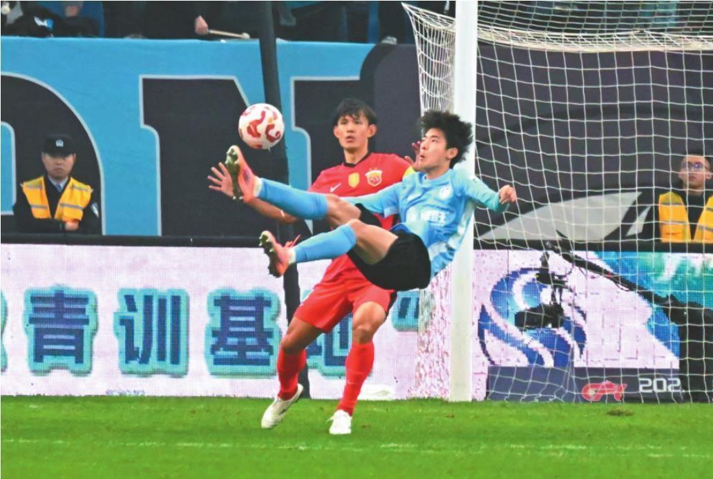 英博海发队球员朱鹏宇(前)倒钩射门。 辽宁日报记者 孙海涛 摄